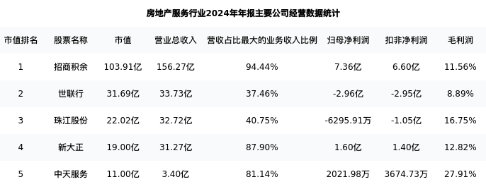 珠江股份最新报告期数据为年报,下表汇总了房地产服务行业内市值靠前的公司年报主要经营数据