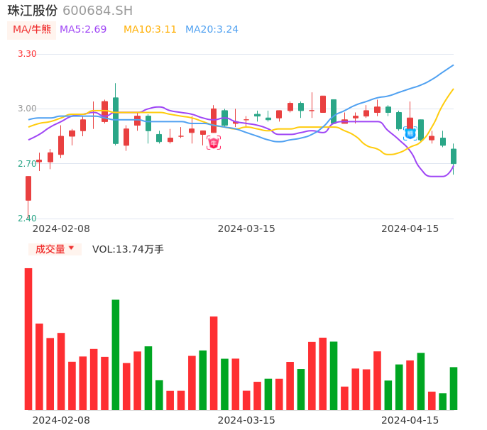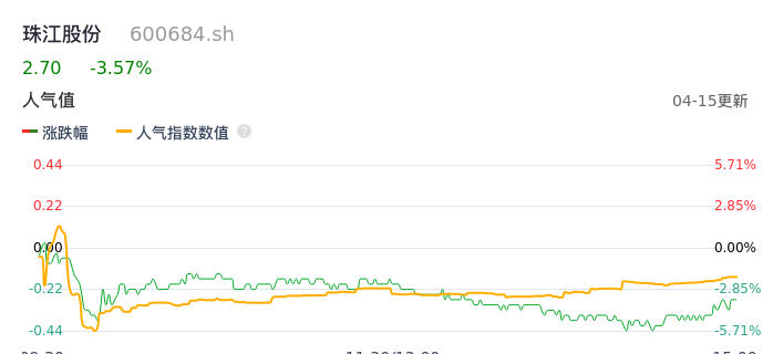 04月15日,珠江股份收报2.70,股价涨幅-3.57%,成交金额3722.90万元,换手率1.61%。
