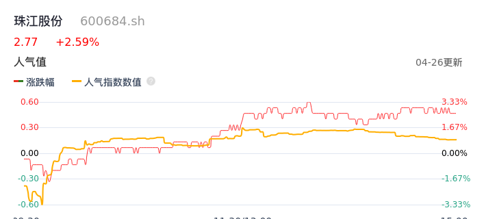 04月26日,珠江股份收报2.77,股价涨幅2.59%,成交金额2211.48万元,换手率0.95%。