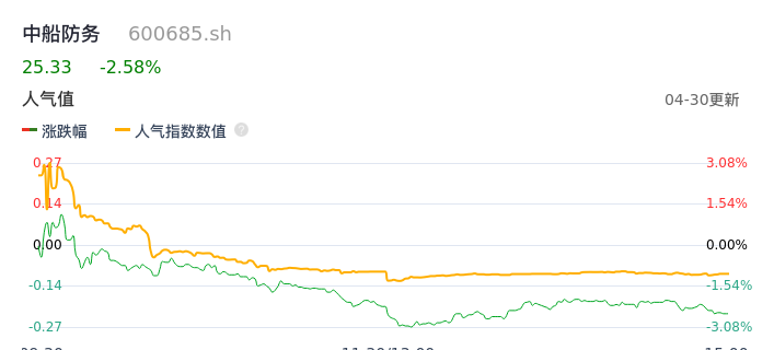 04月30日,中船防务收报25.33,股价涨幅-2.58%,成交金额2.35亿元,换手率1.12%。