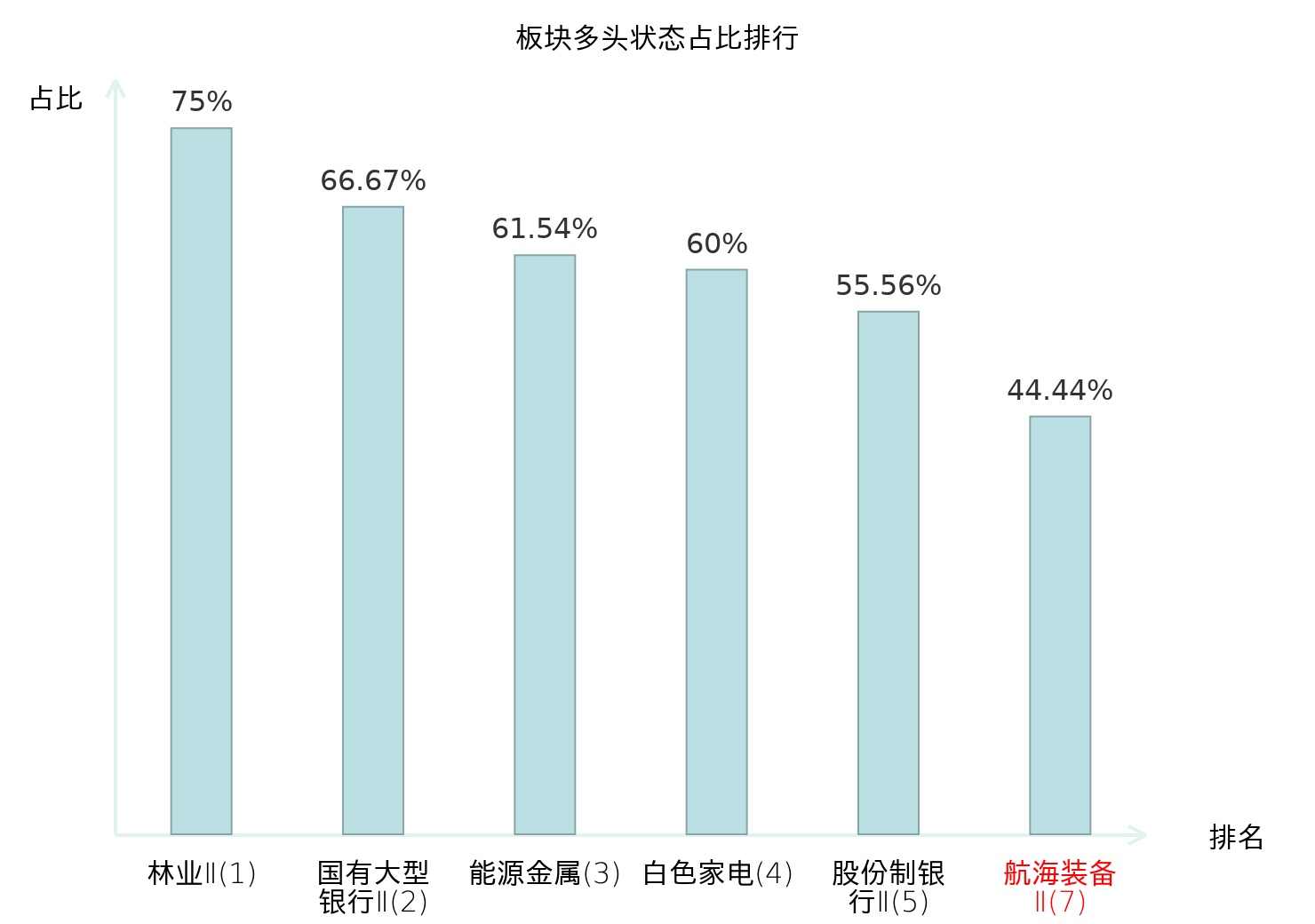 全市场所有行业板块中主力多头状态占比排名中,林业Ⅱ板块位居第一。数字媒体板块名次提升最快,较昨日上升48位。