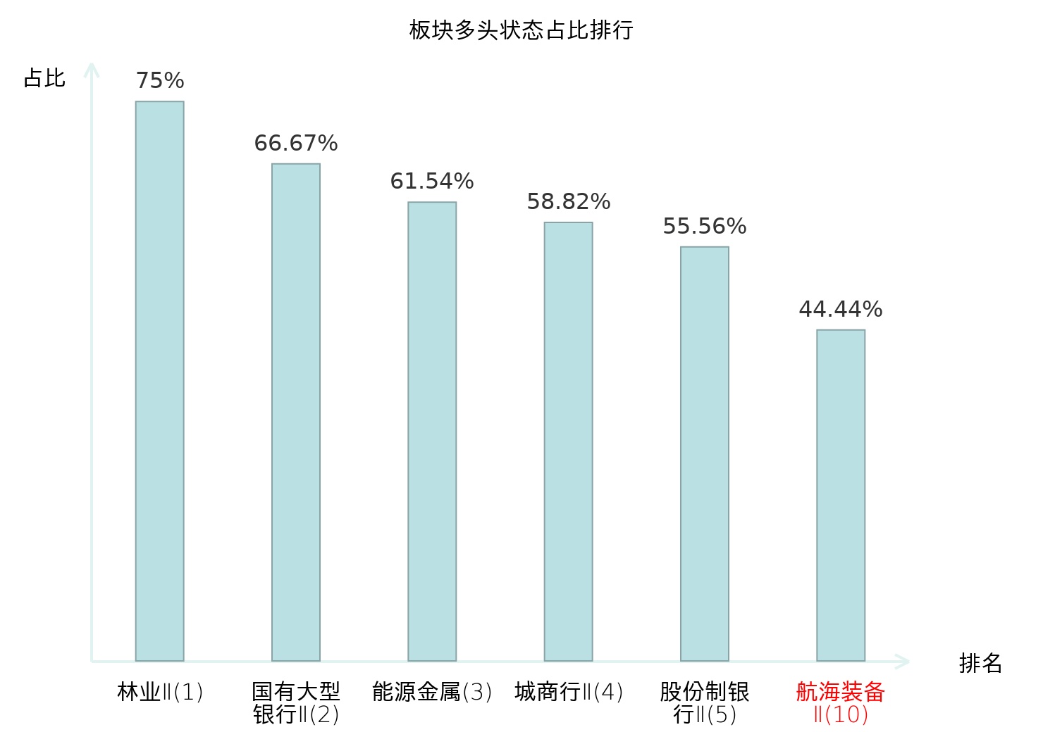 全市场所有行业板块中主力多头状态占比排名中,林业Ⅱ板块位居第一。专业连锁Ⅱ板块名次提升最快,较昨日上升63位。