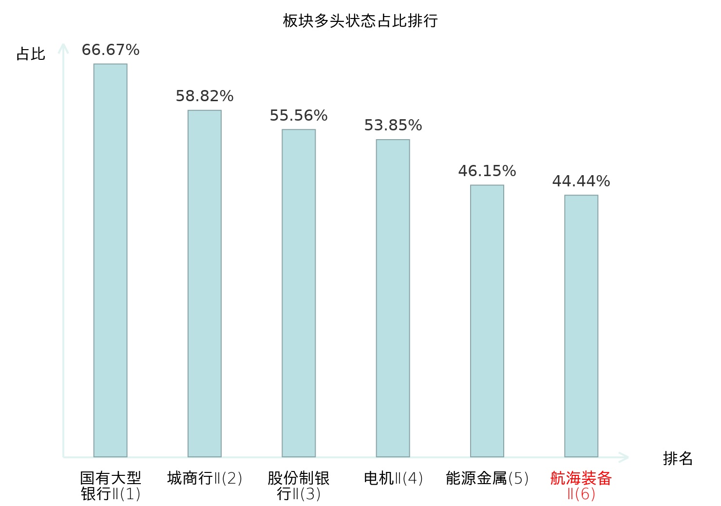 全市场所有行业板块中主力多头状态占比排名中,国有大型银行Ⅱ板块位居第一。自动化设备板块名次提升最快,较昨日上升57位。