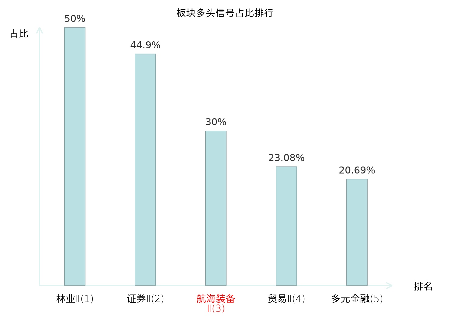 全市场所有行业板块中主力多头信号占比排名中,林业Ⅱ板块位居第一。林业Ⅱ板块名次提升最快,较昨日上升125位。