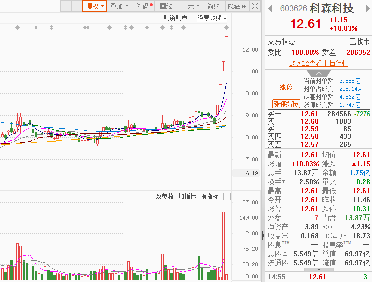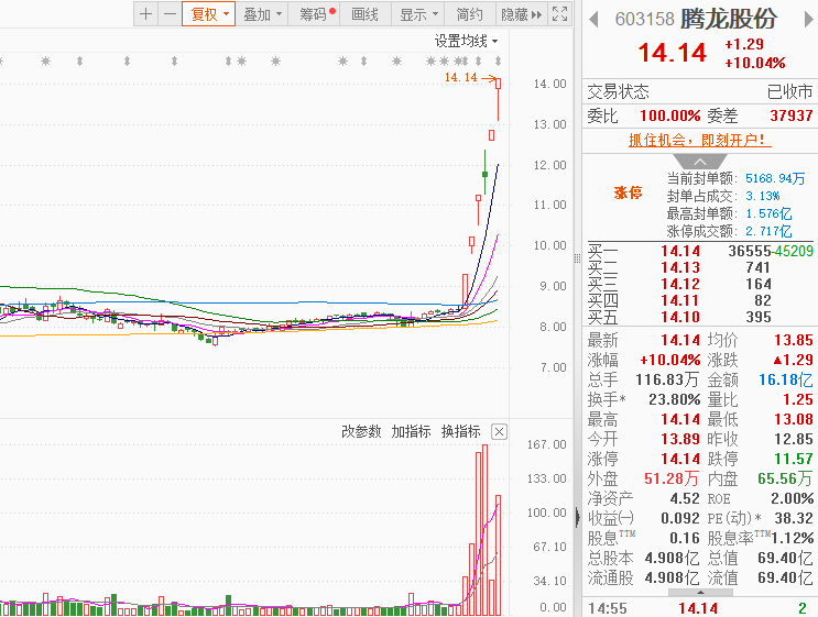 市场情绪:两市成交额连续6个交易日超2万亿,市场热点集中在半导体芯片、消费电子、汽车整车以及白酒消费,个股涨多跌少,全市场超3600只个股上涨。今日共86股涨停,连板股总数16只,21股封板未遂,封板率为80%(不含ST股、退市股)。焦点股方面,济民健康晋级5连板,汽车产业链的腾龙股份6天5板,算力产业链的电子城7天5板、汉钟精机4连板,机器人叠加消费电子概念的科森科技4连板。