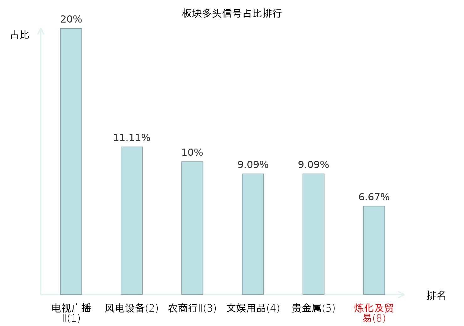 全市场所有行业板块中主力多头信号占比排名中,电视广播Ⅱ板块位居第一。农商行Ⅱ板块名次提升最快,较昨日上升112位。