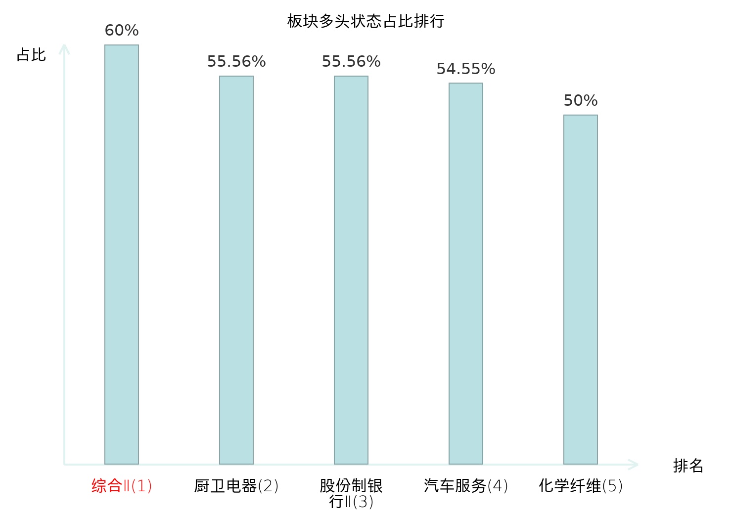 全市场所有行业板块中主力多头状态占比排名中,综合Ⅱ板块位居第一。出版板块名次提升最快,较昨日上升55位。