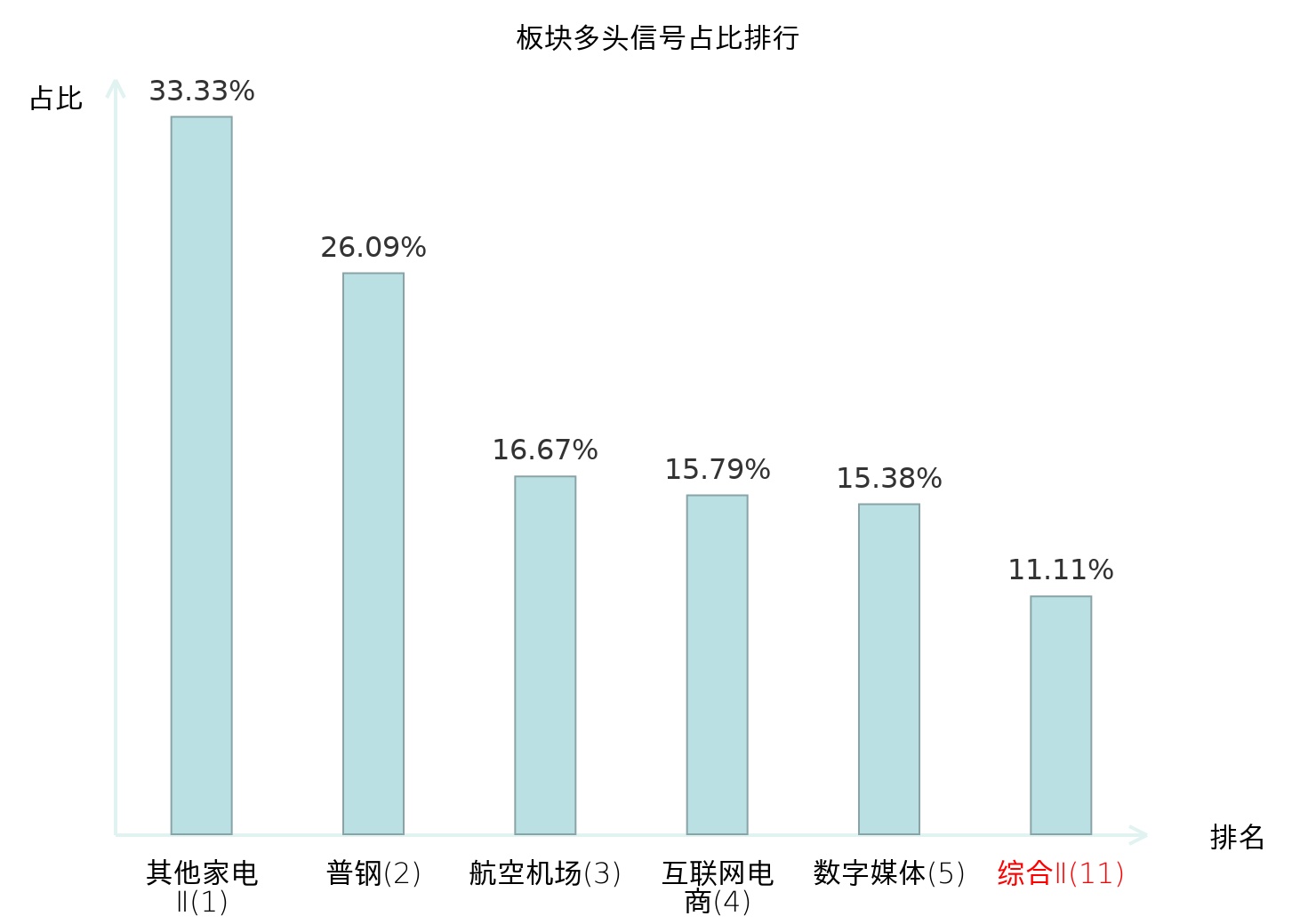 全市场所有行业板块中主力多头信号占比排名中,其他家电Ⅱ板块位居第一。其他家电Ⅱ板块名次提升最快,较昨日上升129位。