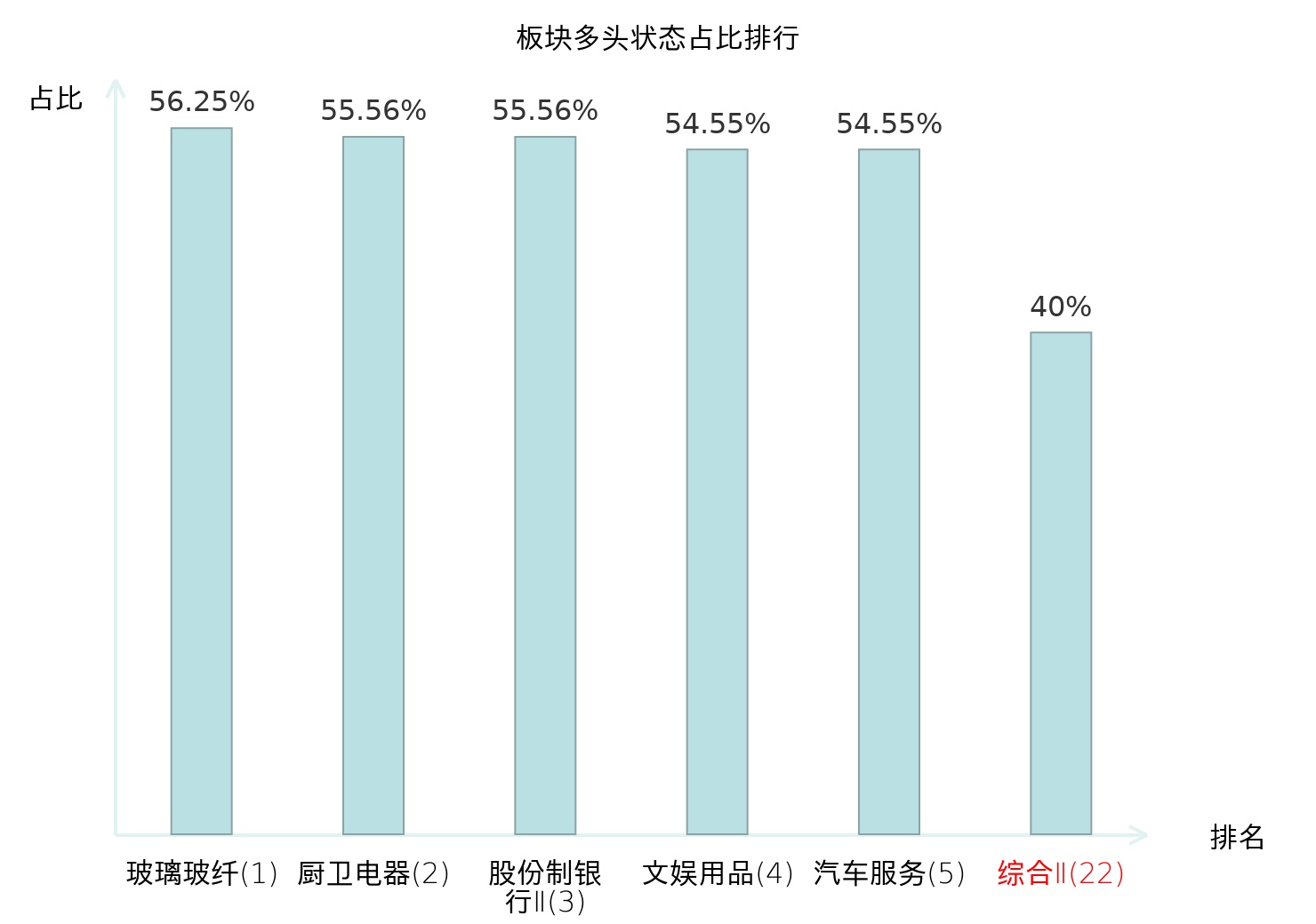 全市场所有行业板块中主力多头状态占比排名中,玻璃玻纤板块位居第一。航天装备Ⅱ板块名次提升最快,较昨日上升84位。