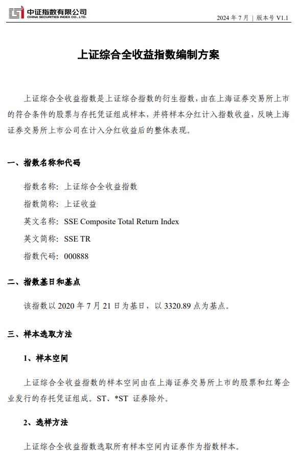 ►7月29日今天,“加强版”上证指数迎来首秀。根据此前安排,上交所与中证指数有限公司决定自2024年7月29日起正式发布上证综合全收益指数实时行情,同时将指数代码和简称分别调整为“000888”和“上证收益”。据上证综合全收益指数编制方案显示,上证综合全收益指数是上证综合指数的衍生指数,由在上海证券交易所上市的符合条件的股票与存托凭证组成样本,并将样本分红计入指数收益,反映上海证券交易所上市公司在计入分红收益后的整体表现。上证综合全收益指数以2020年7月21日为基日,以3320.89点为基点。样本空间由在上海证券交易所上市的股票和红筹企业发行的存托凭证组成。ST、*ST证券除外。