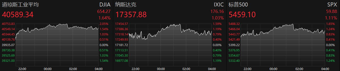 ►美股上周五收高,三大指数均涨超1%,道指上涨逾650点。美国6月核心PCE指数高于预期,显示通胀温和上升,提振了市场乐观情绪,投资者重返被广泛抛售的科技股。可能有助于美联储官员增强对通胀正朝着2%目标迈进的信心。截至收盘,道琼斯指数涨1.64%,标普500指数涨1.11%,纳斯达克指数涨1.03%,热门中概股普涨,纳斯达克中国金龙指数涨1.22%。