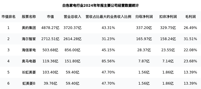 海尔智家最新报告期数据为年报,下表汇总了白色家电行业内市值靠前的公司年报主要经营数据