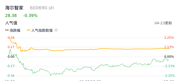 04月23日,海尔智家收报28.38,股价涨幅-0.39%,成交金额9.32亿元,换手率0.52%。