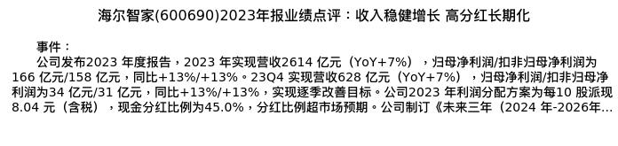 值得注意的是:2024年04月光大证券的洪吉然分析师,首次发布关于海尔智家的研究报告,标题为:海尔智家(600690)2023年报业绩点评:收入稳健增长 高分红长期化。