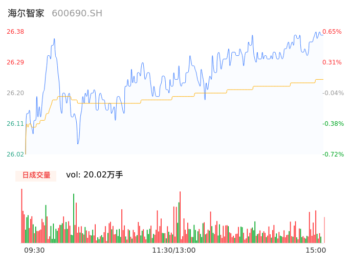 04月11日,海尔智家收报26.38,股价涨幅0.65%,成交金额5.25亿元,换手率0.32%。