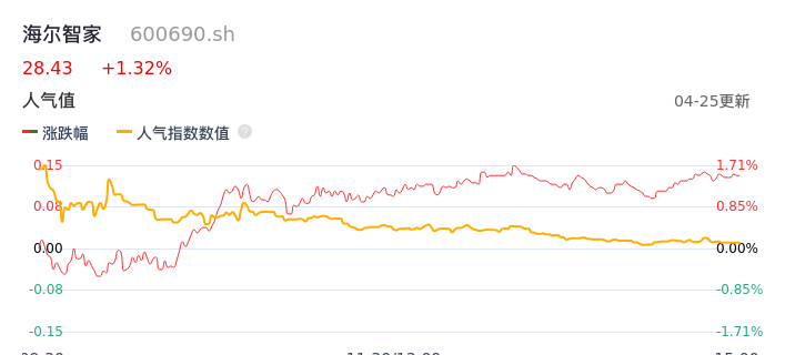 04月25日,海尔智家收报28.43,股价涨幅1.32%,成交金额7.96亿元,换手率0.45%。