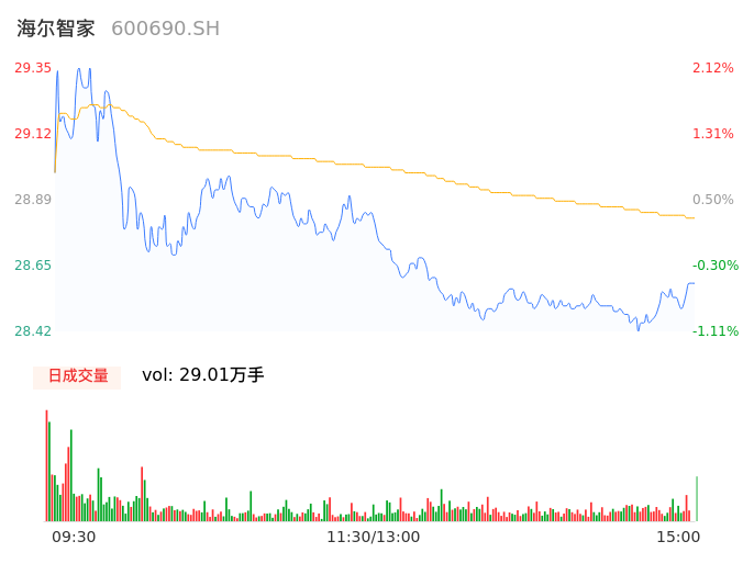 04月22日,海尔智家收报28.49,股价涨幅-0.87%,成交金额8.36亿元,换手率0.46%。