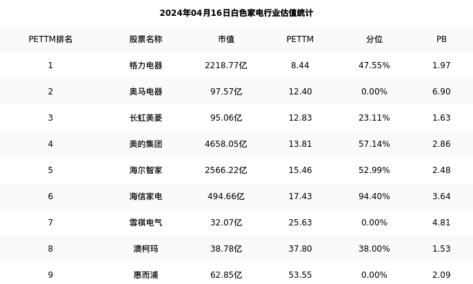 从估值角度看:海尔智家最新市盈率PETTM为15.46,在行业内排名5/9,处于52.99分位。