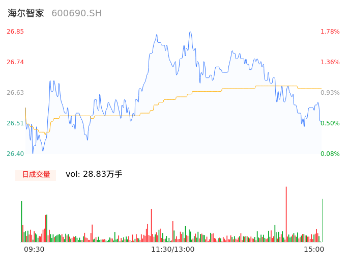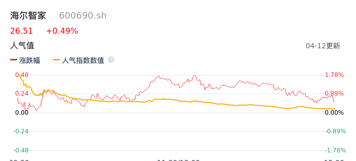 04月12日,海尔智家收报26.51,股价涨幅0.49%,成交金额7.68亿元,换手率0.46%。