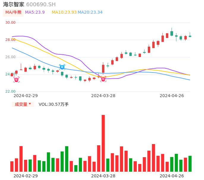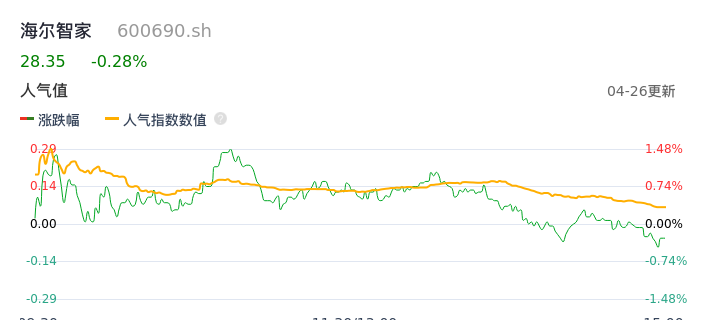 04月26日,海尔智家收报28.35,股价涨幅-0.28%,成交金额8.73亿元,换手率0.48%。