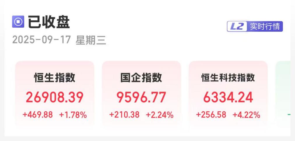 上证报中国证券网讯9月17日,港股三大指数集体收涨。截至收盘,恒生指数涨1.78%,报26908.39点;恒生国企指数涨2.24%,报9596.77点;恒生科技指数大涨4.22%,报6334.24点,创阶段新高。
