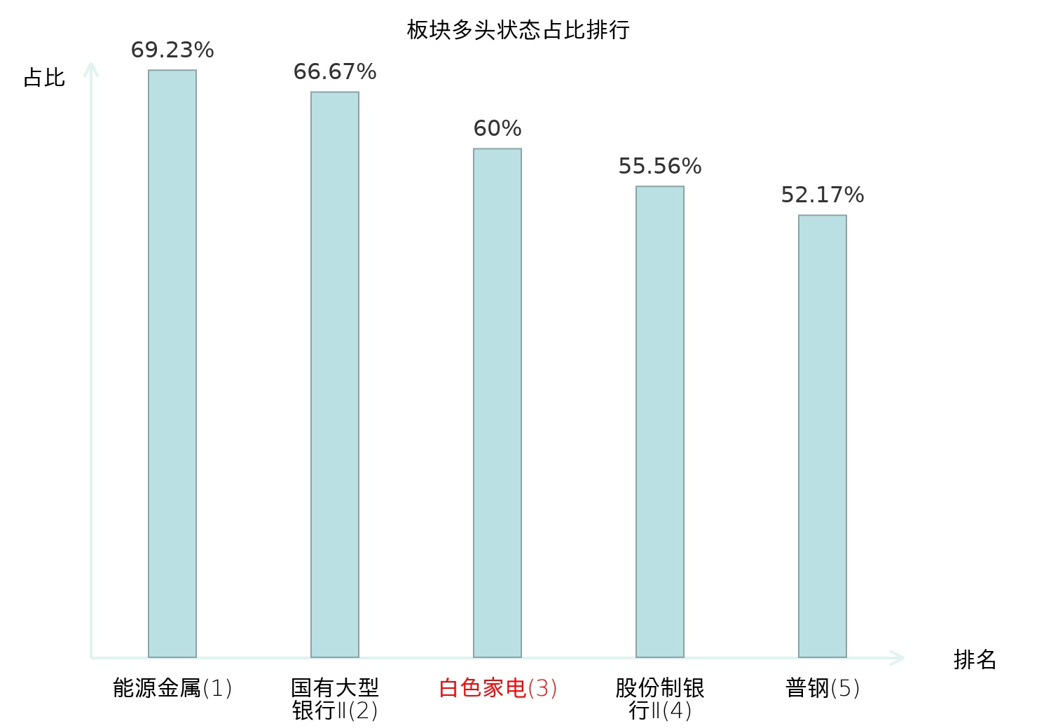全市场所有行业板块中主力多头状态占比排名中,能源金属板块位居第一。贸易Ⅱ板块名次提升最快,较昨日上升69位。