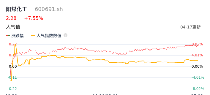 04月17日,阳煤化工收报2.28,股价涨幅7.55%,成交金额6911.99万元,换手率1.31%。