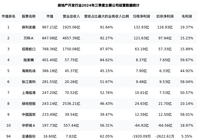 亚通股份最新报告期数据为三季度,下表汇总了房地产开发行业内市值靠前的公司三季度主要经营数据