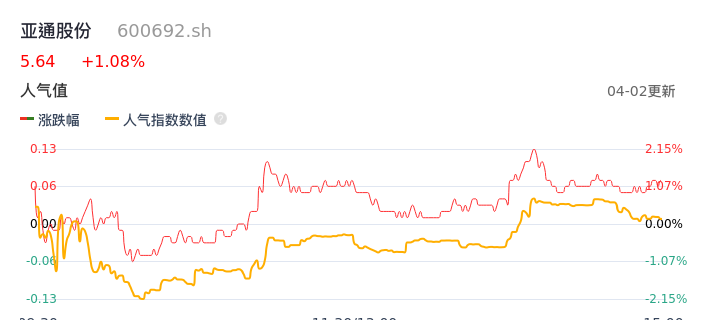 04月02日,亚通股份收报5.64,股价涨幅1.08%,成交金额8909.96万元,换手率6.22%。