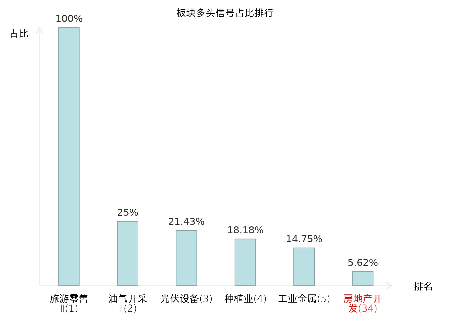 全市场所有行业板块中主力多头信号占比排名中,旅游零售Ⅱ板块位居第一。旅游零售Ⅱ板块名次提升最快,较昨日上升130位。