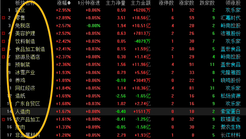 大消费最强的还是零售方向,涨停最多,而且人气标杆股在【国光连锁】【步步高】【国芳集团】这些都是前期很有辨识度的,当然还有很多涨幅还不是很大的三江购物、永辉超市筹码还没有大幅分散的,后续还会有机会,多在跌时低吸。