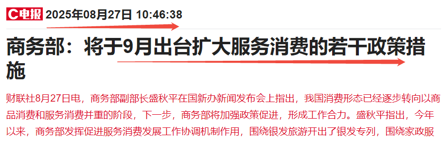再而商务部早在8月底就发布重磅预告,9月会出台一系列重磅促消费政策,前几天浙江绍兴这边已有动作。