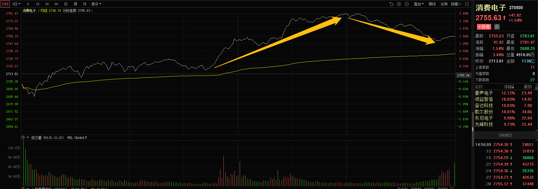 消费电子下午还继续冲高了一番,其中歌尔股份奋达科技还成功封板,但是尾盘在淳中科技的跳水影响下,消费电子不少个股也有回落胜利精密板上被砸,左侧的密集成交区压力毕竟大,需要时间多消化正常。去年四季度国家大力实行消费电子及家电的以旧换新政策,很多的个股的业绩也都有所转暖,现在正值中报密集披露期,如果你手中的消费电子个股连中报依旧表现比较弱的,要注意,多关注业绩增长或者有增长预期的消费电子个股。