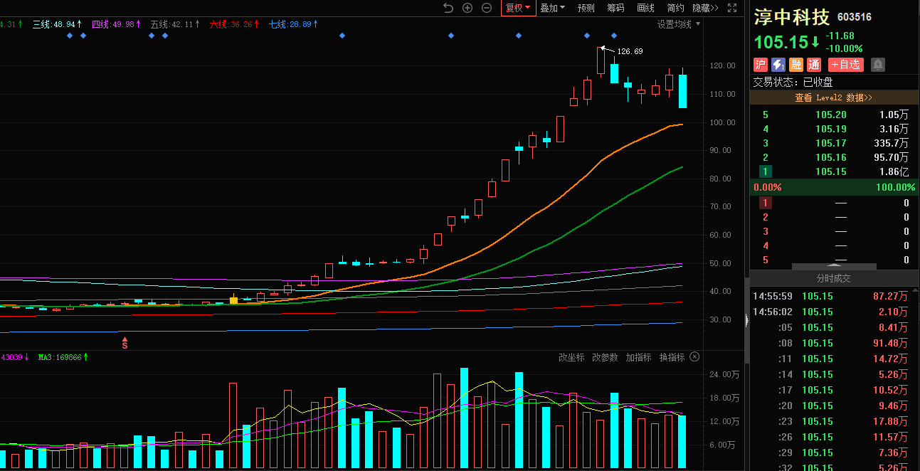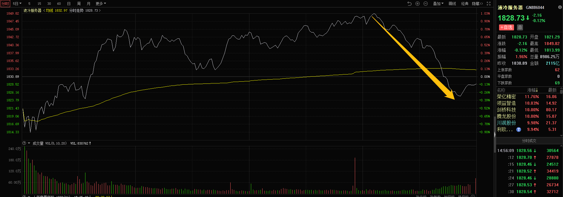 淳中科技作为液冷近期的热门军工,它的跌停对于液冷板块的影响还是比较明显的。尾盘板块指数的跳水较为明显,就连大元泵业都开板,液冷短期也有一定的回踩的需求,可以等调整两天之后再参与。