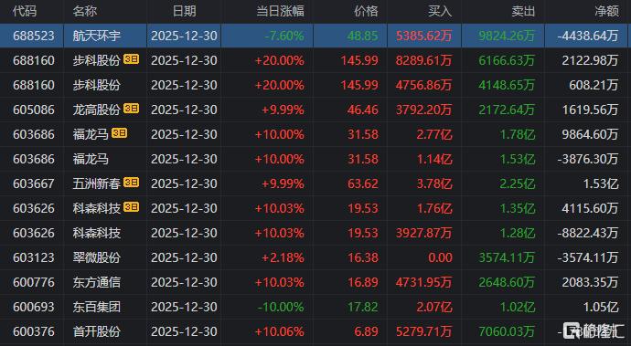龙虎榜单日净买入额前三为三花智控、航天发展、山子高科,分别为11.5亿元、6.87亿元、6.16亿元。