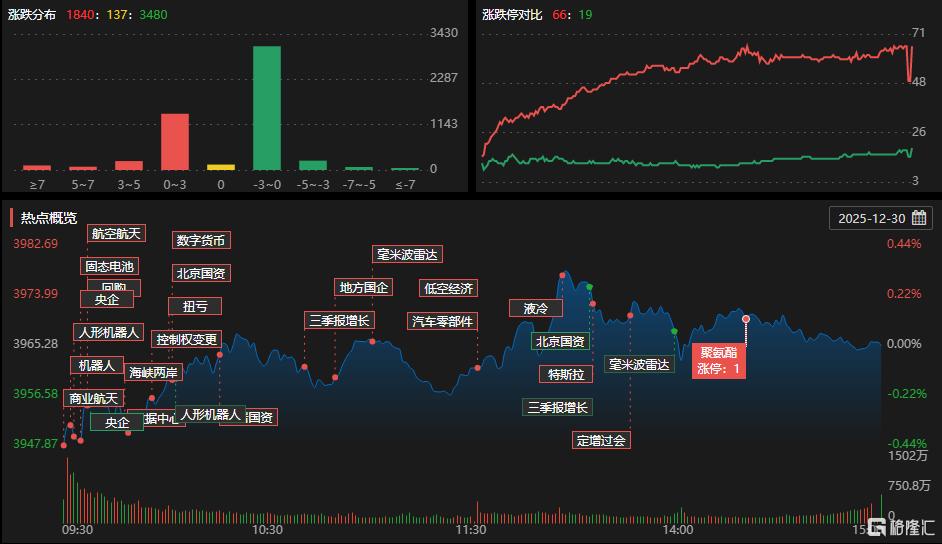 12月30日,沪指录得10连阳,全市场成交额2.16万亿元,近3500股下跌。市场热点聚焦机器人、汽车零部件板块;海南板块下挫。