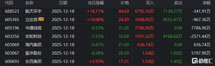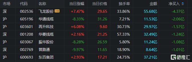 龙虎榜单日净卖出额前三为华通线缆、再升科技、华菱线缆,分别为2.06亿元、1.57亿元、1.24亿元。