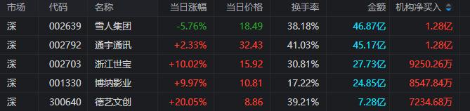 龙虎榜中涉及机构专用席位的个股中,当日净买入额前三为雪人集团、通宇通讯、浙江世宝,分别为1.28亿元、1.28亿元、9250.26万元。