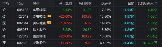 龙虎榜中涉及机构专用席位的个股中,单日净卖出额前三为华通线缆、振华股份、龙洲股份,分别为4.4亿元、1.17亿元、7616.22万元。
