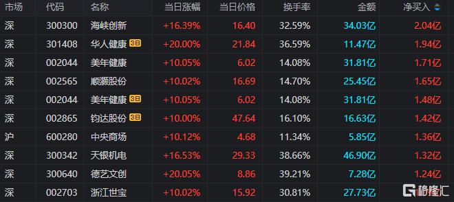 龙虎榜单日净买入额前三为海峡创新、美年健康、顺灏股份,分别为2.04亿元、1.71亿元、1.65亿元。