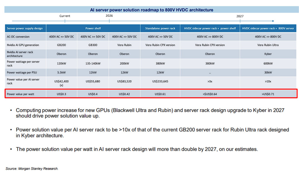 大摩预计,到2027年,为Rubin Ultra机柜(采用Kyber架构)设计的电源解决方案,其单机柜价值将是当前GB200服务器机柜的10倍以上。同时,到2027年,AI服务器机柜中每瓦功耗对应的电源方案价值,也将比现阶段翻倍。