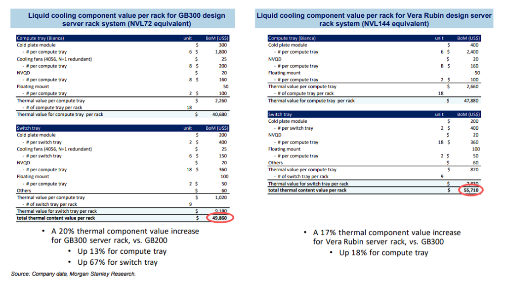 一个GB300(NVL72)机柜的散热组件总价值约为49,860美元。而到了下一代Vera Rubin(NVL144)平台,由于计算托盘和交换机托盘的散热需求进一步提升,单机柜的散热组件总价值将增长17%,达到55,710美元。其中,为交换机托盘设计的散热模组价值增幅高达67%。
