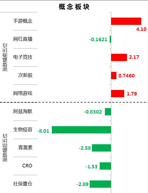 概念板块今日偶143个收涨(昨日228个),全天只有18个录得主力净流入(昨日80个),次新股净流入额较少,游戏类概念表现突出,医药类概念抛压凸显。