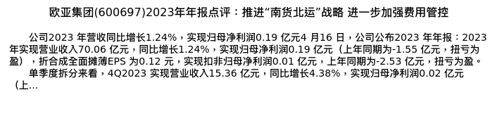 值得注意的是:2024年04月光大证券的唐佳睿/田然分析师,首次发布关于欧亚集团的研究报告,标题为:欧亚集团(600697)2023年年报点评:推进“南货北运”战略 进一步加强费用管控。