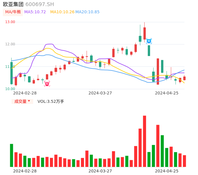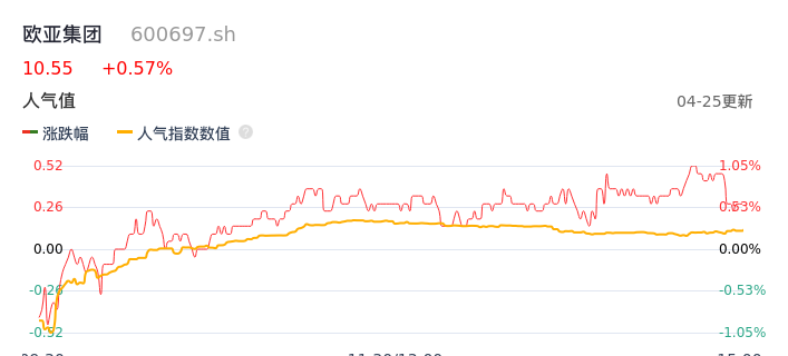 04月25日,欧亚集团收报10.55,股价涨幅0.57%,成交金额3702.95万元,换手率2.26%。