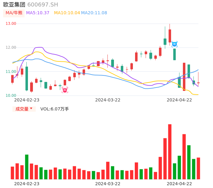 04月22日,欧亚集团收报10.54,股价涨幅0.67%,成交金额6422.38万元,换手率3.91%。