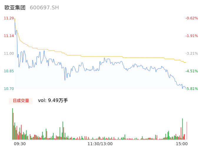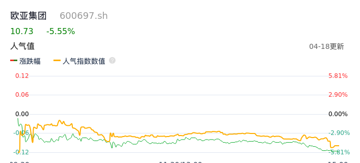 04月18日,欧亚集团收报10.73,股价涨幅-5.55%,成交金额1.04亿元,换手率6.12%。