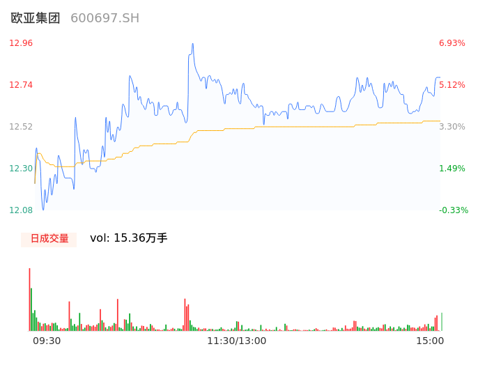 04月12日,欧亚集团收报12.75,股价涨幅5.20%,成交金额1.93亿元,换手率9.89%。
