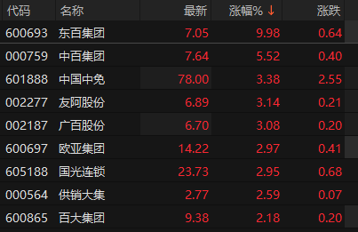上证报中国证券网讯 11月5日早盘,零售概念股拉升,截至9时54分,东百集团涨停,中百集团涨超5%,中国中免、友阿股份、广百股份涨超3%,国光连锁、欧亚集团等跟涨。