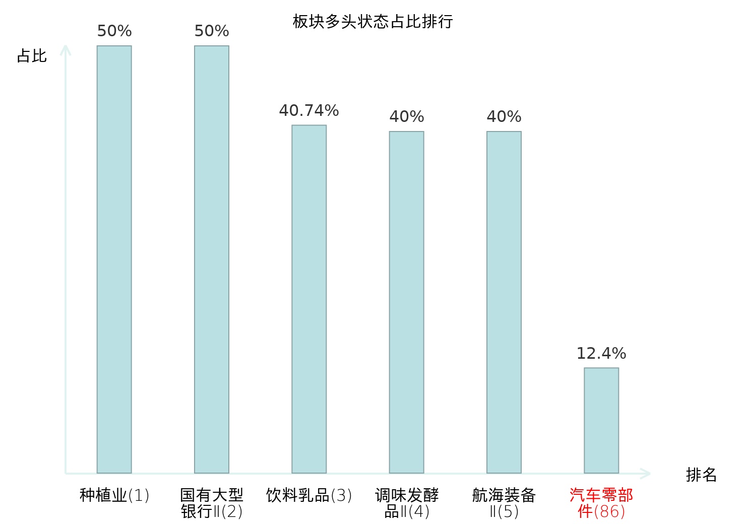全市场所有行业板块中主力多头状态占比排名中,种植业板块位居第一。冶钢原料板块名次提升最快,较昨日上升89位。